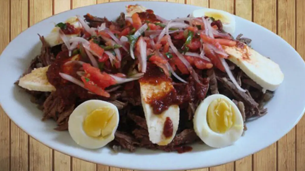 Esta elaborado con chuño, papa, carne de res, ají frito que cubre todo lo que está encima acompañado de cebolla, rodajas de huevo y queso, una delicia que envolverá tu paladar y te dejará con la boca abierta.