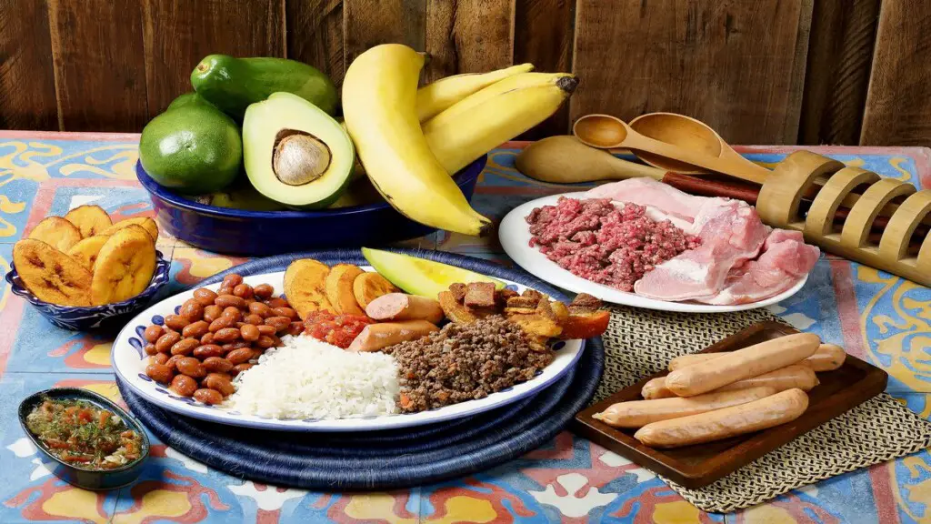 Está elaborada con arroz blanco, frijoles rojos, carne molida o picada, plátano, chorizo, maíz, chicharrón de cerdo, huevo frito, arepa y un aguacate, lo que la convierte en una comida completa perfecta para deslumbrar.