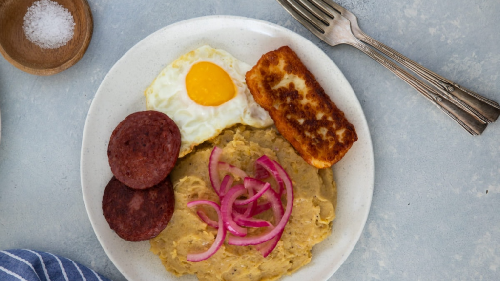 Suele ir acompañado por queso frito, salami y huevos, aliados perfectos que le confieren un toque especial, lleno de sabor, además de un sofrito de cebolla fascinante.